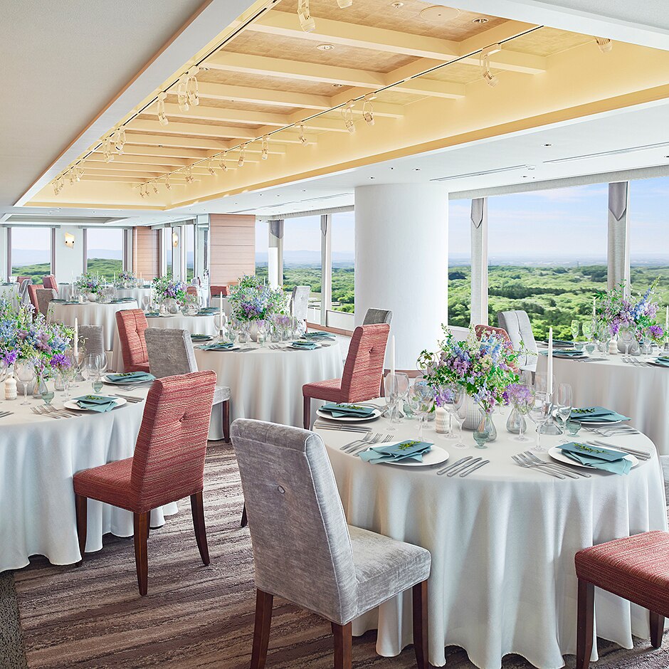 結婚式のスタイルはカップルごとに異なるもの。同ホテルには、そんな100人100色の希望を叶えるパーティ会場が充実!ゲストと一緒に盛り上がれる大空間、雄大な景色を見渡すレストランなど幅広いラインナップに注目を