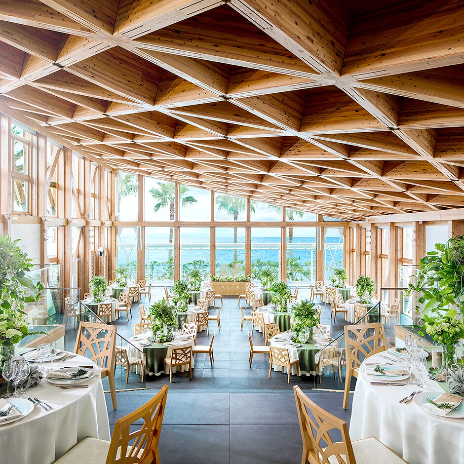 たくさんの天然木を組み上げ、石と硝子で構成されたチャペル。厳かで神聖な雰囲気。自然の祝福を感じて。高い天井と天然木に反響する音楽は荘厳な雰囲気を、溢れる太陽光と緑は寛ぎの空間を提供してくれる。
