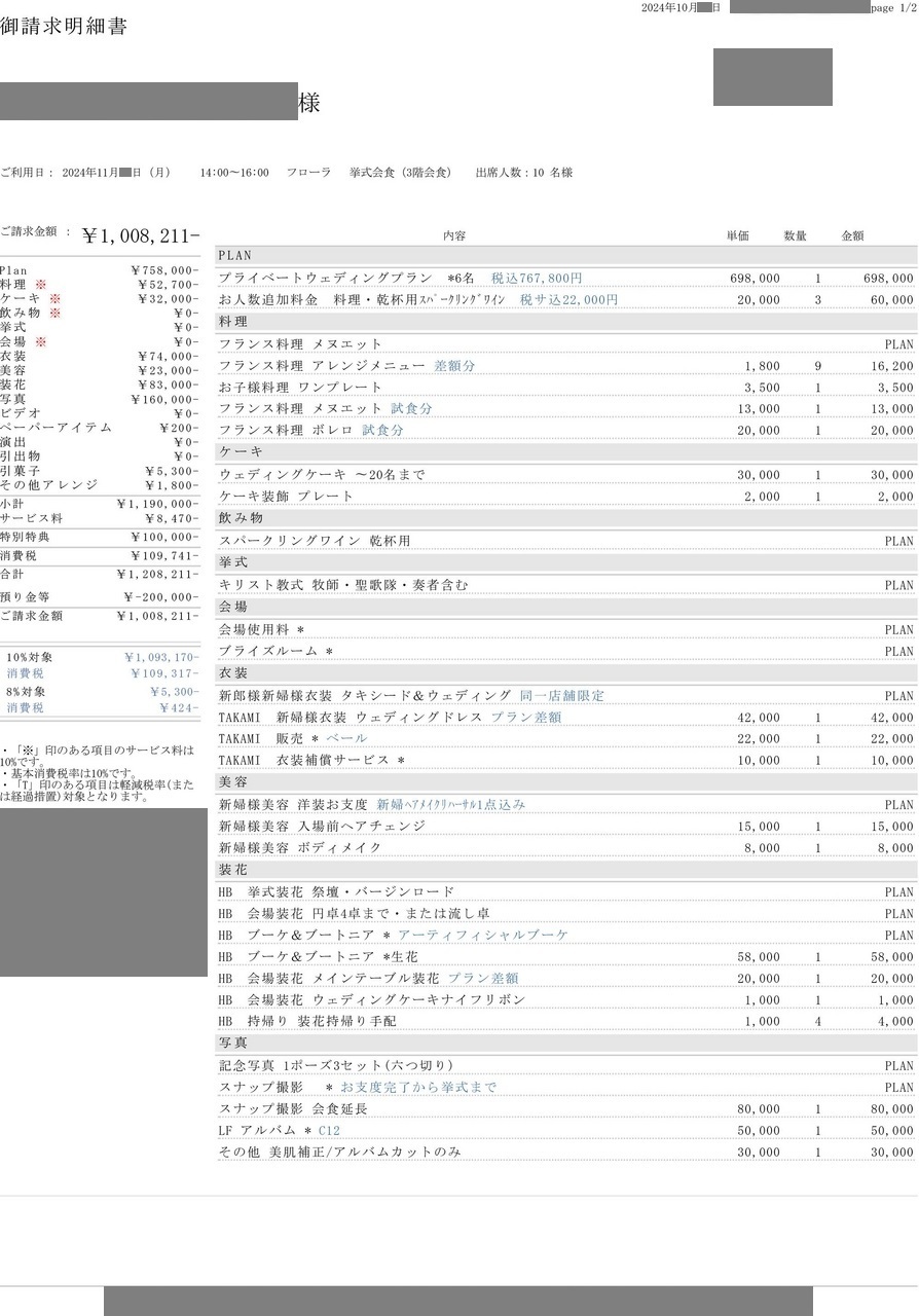※投稿された金額情報は、日取り、申込みのタイミングや会場の空き状況等によって異なるため、最終費用明細の項目や金額をもとにした、式場との価格交渉や追加サービス等の要望はご遠慮ください。
