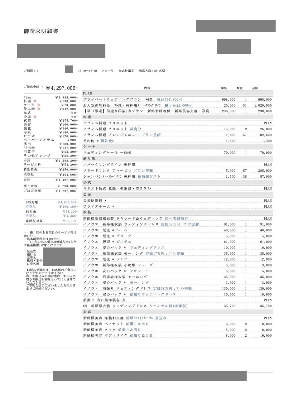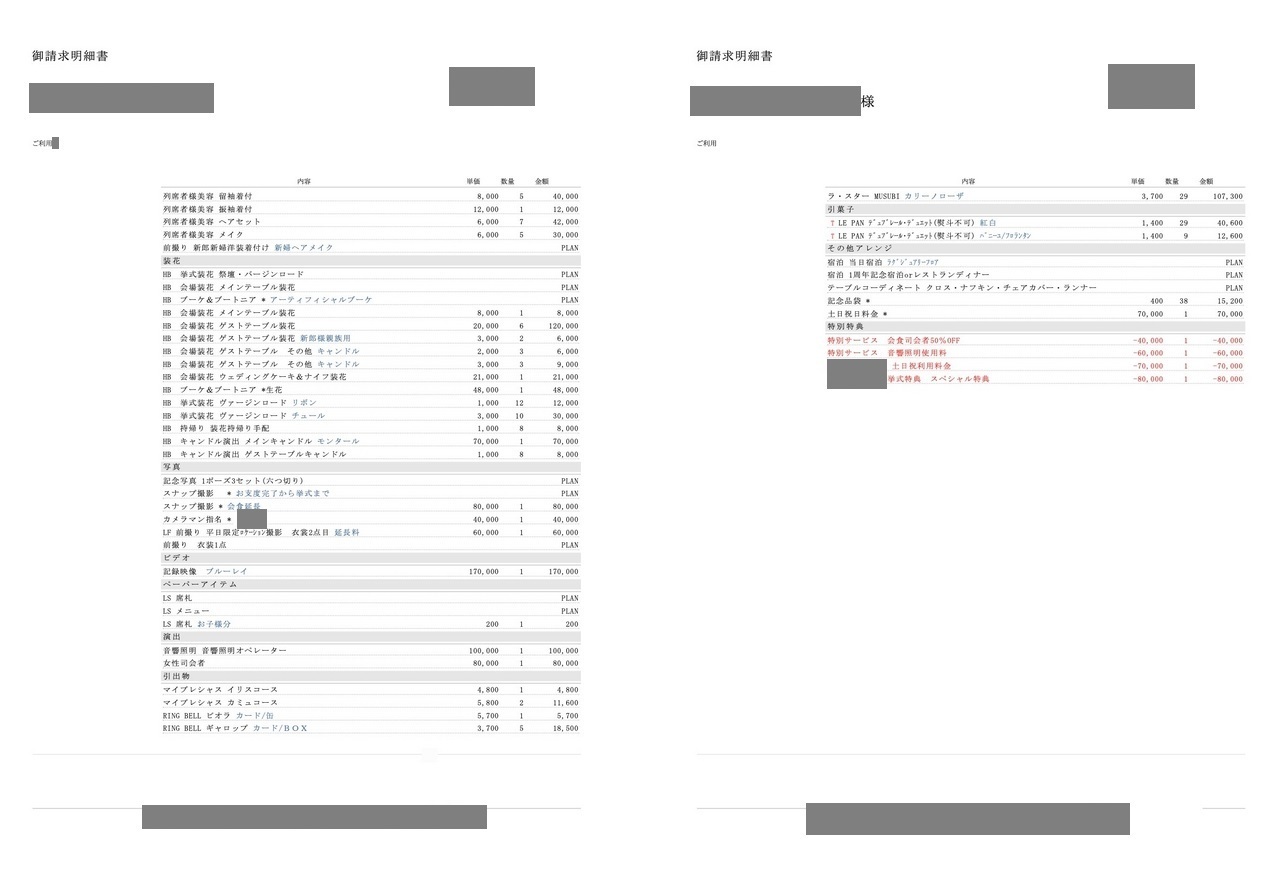 ※料金実例では申込金などを含む会場に支払った"総額"を表示しています。また、料金明細画像の項目名をもとに独自の基準で分類しています。