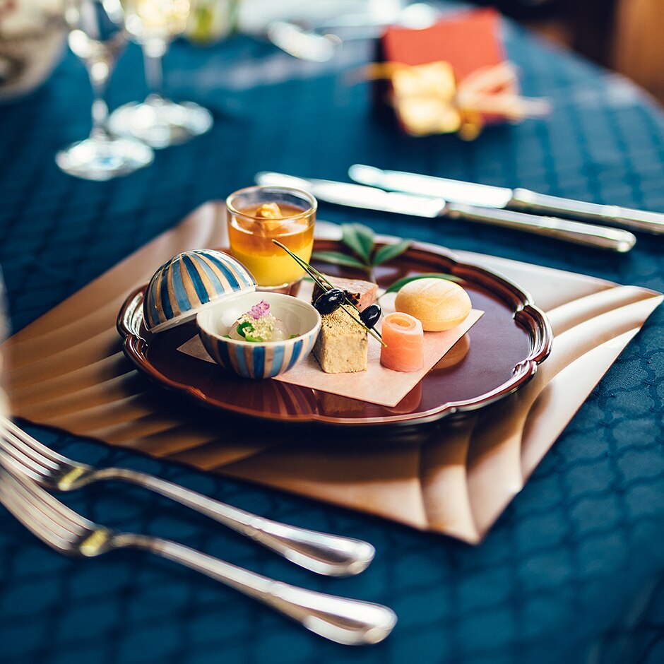 華やかな前菜にはじまり心ときめくデセールまで、幅広い世代から愛される味が求められる婚礼料理。こだわり抜かれたコースは洗練と温もりを兼ね備え、軽やかなフレンチに和のエッセンスをさりげなく加えたメニュー。