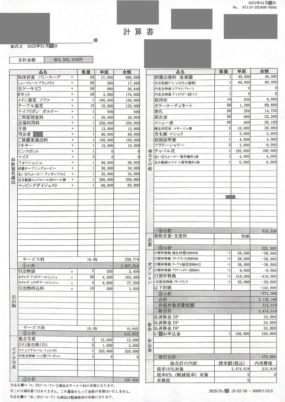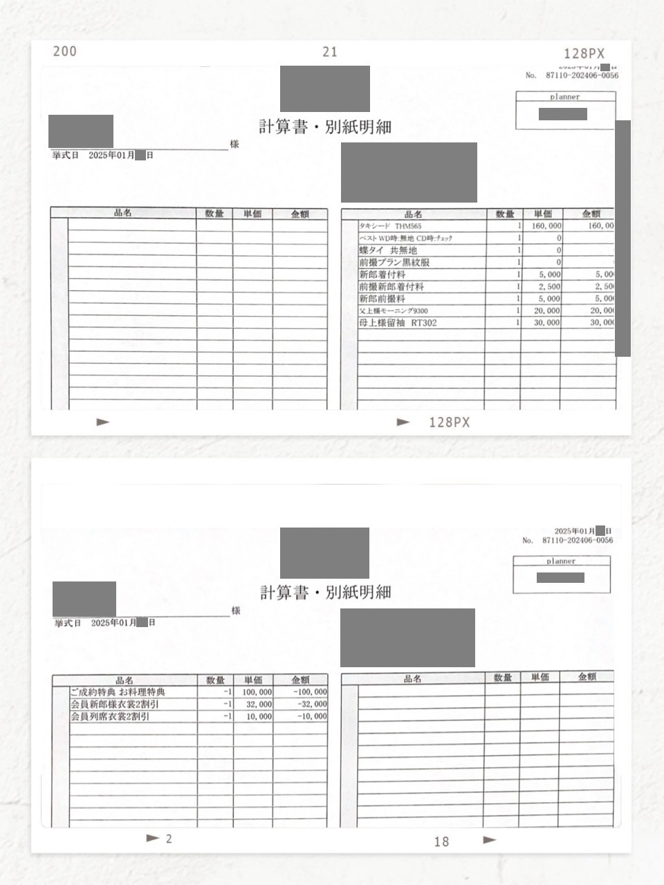※料金実例では申込金などを含む会場に支払った"総額"を表示しています。また、料金明細画像の項目名をもとに独自の基準で分類しています。