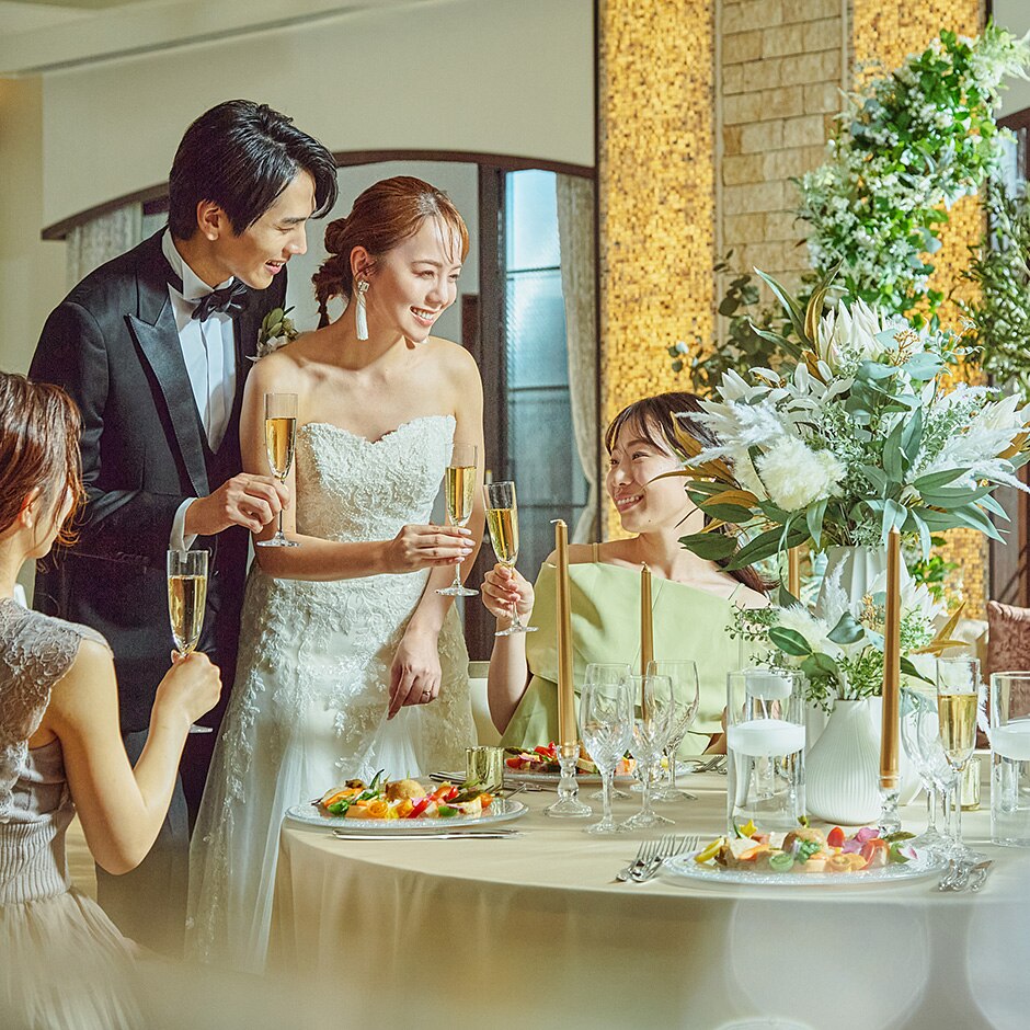 ふたりの席はゴールドが彩る。純白の調度品とマッチして、主役であることを感じられる
