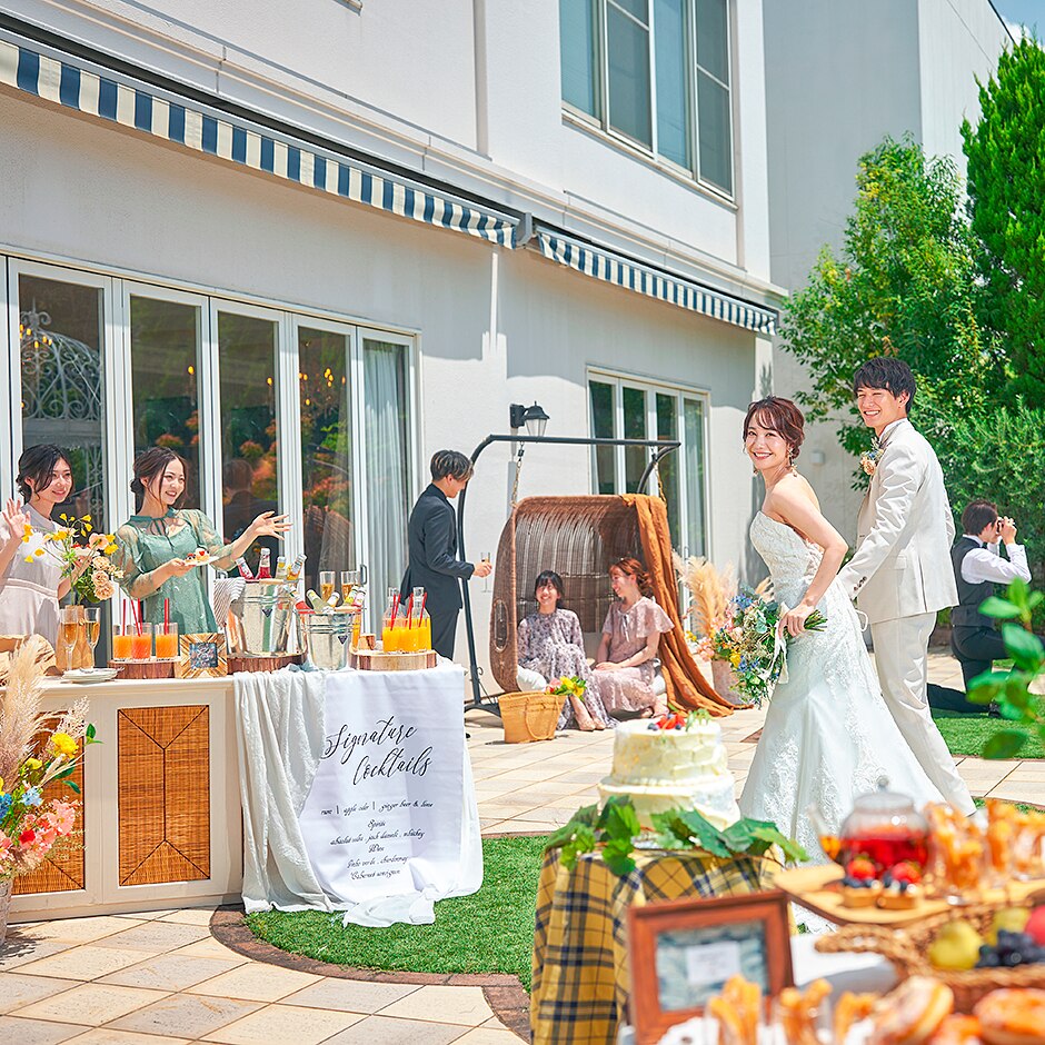 会場隣接のガーデンでデザートビュッフェやケーキカット。タイル部分もあり靴を気にせずに居られる -