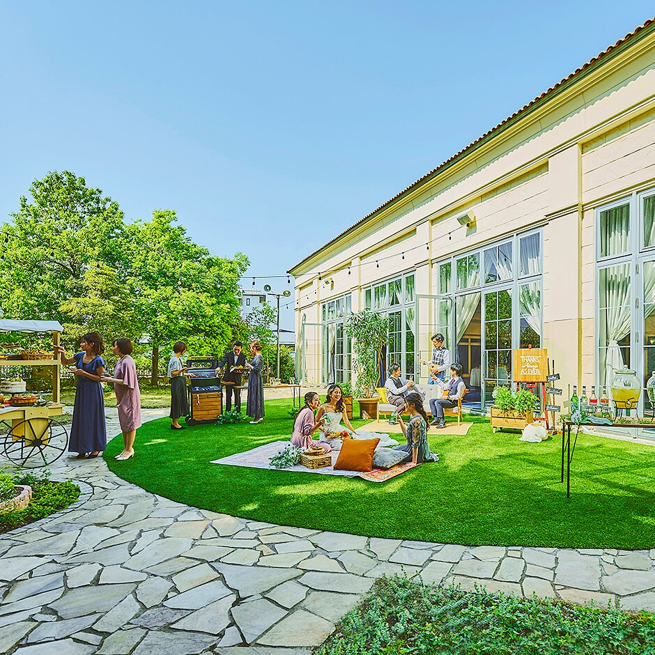 緑ゆたかなオープンエアなプライベートガーデン。装飾や演出も思いのままに叶う。開放感あふれるガーデンは、大勢のゲストを招いてもゆったり過ごせるゆとりの広さも魅力。