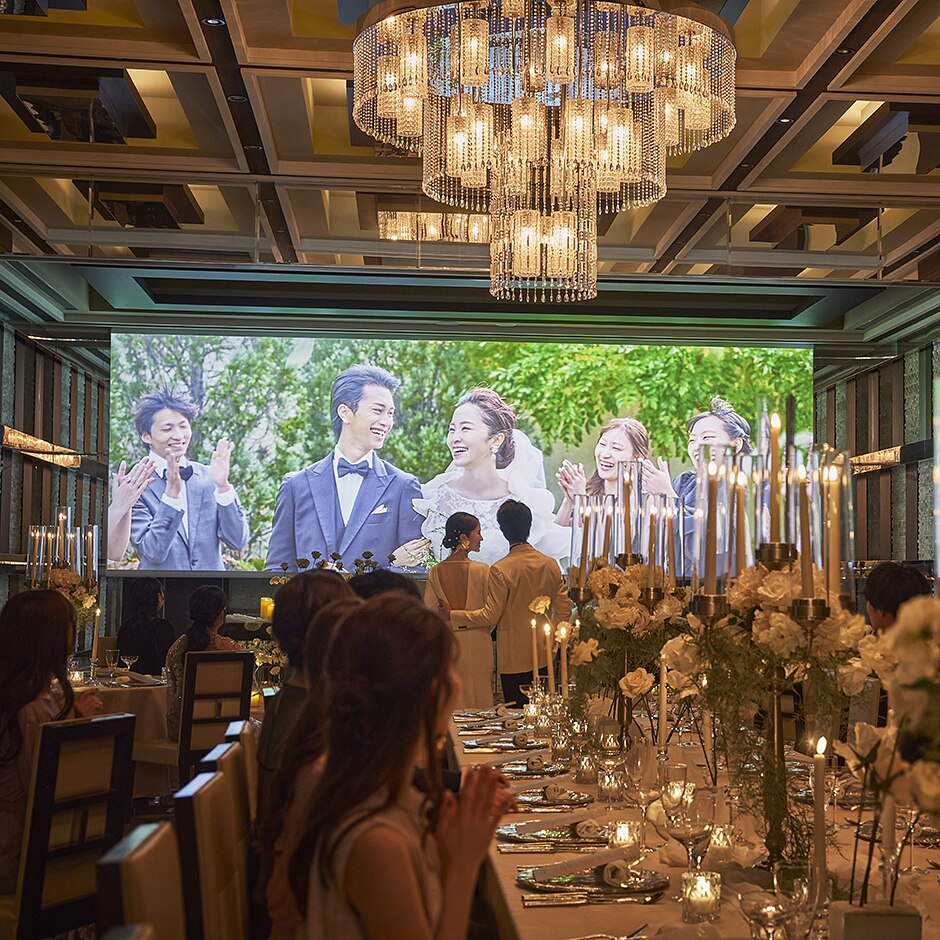 臨場感抜群の音響設備と大迫力の巨大スクリーンでおふたりこだわりの映像もしっかりゲストに見てもらえる!