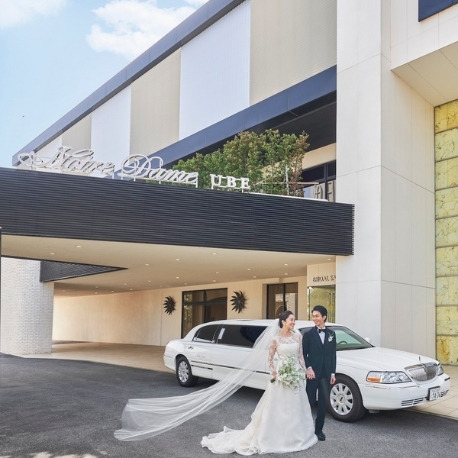 | 駐車場 | 併設駐車場100台完備(無料)お迎え場所や経由地などもおふたりの自由自在♪おふたりにはリムジン送迎も |