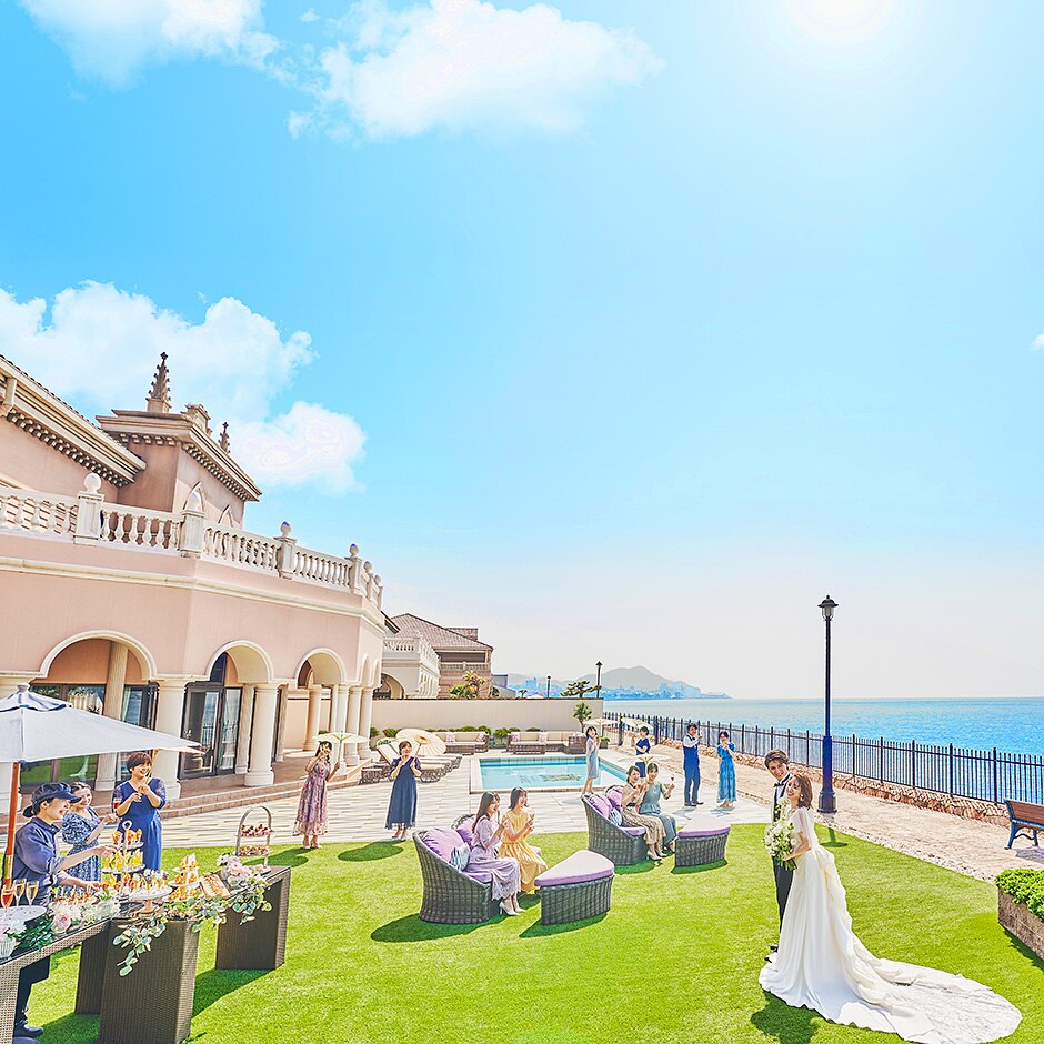 海に面したプライベートガーデンにはプールが併設。絶好のロケーションは前撮りにもオススメ。