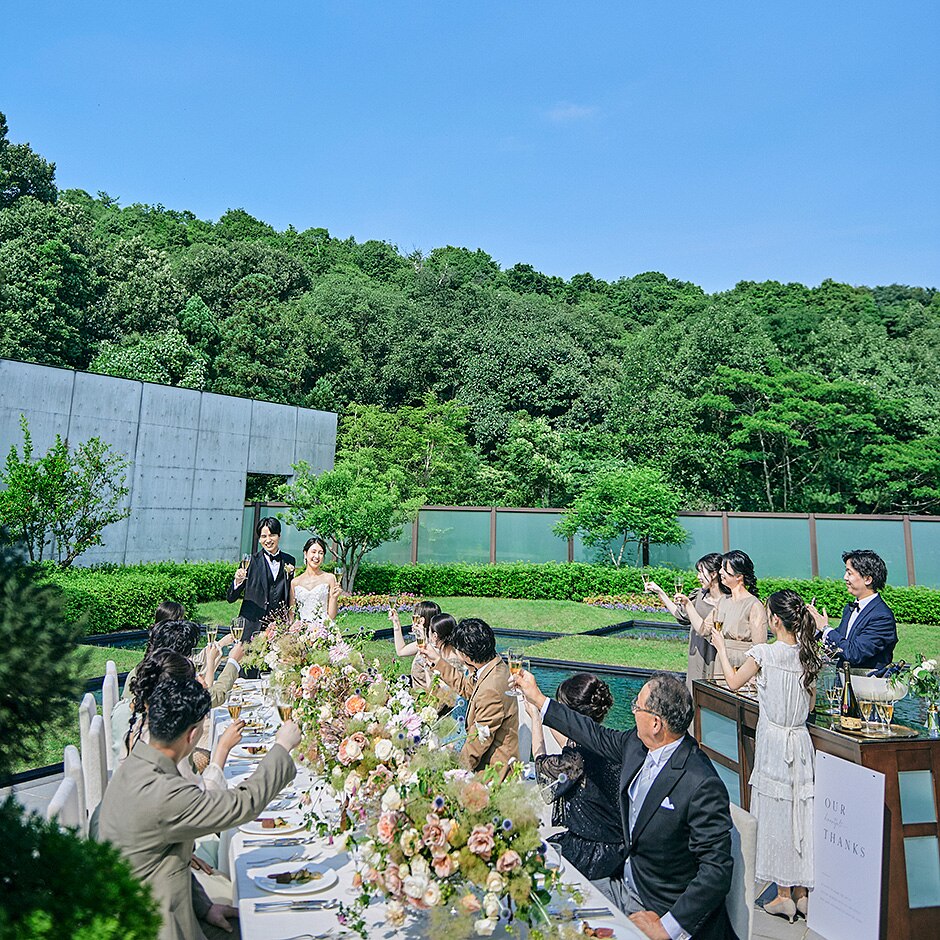 天候を気にせず屋外演出を楽しめる【1st/プールテラス】。ゲスト一人ひとりと言葉を交わして