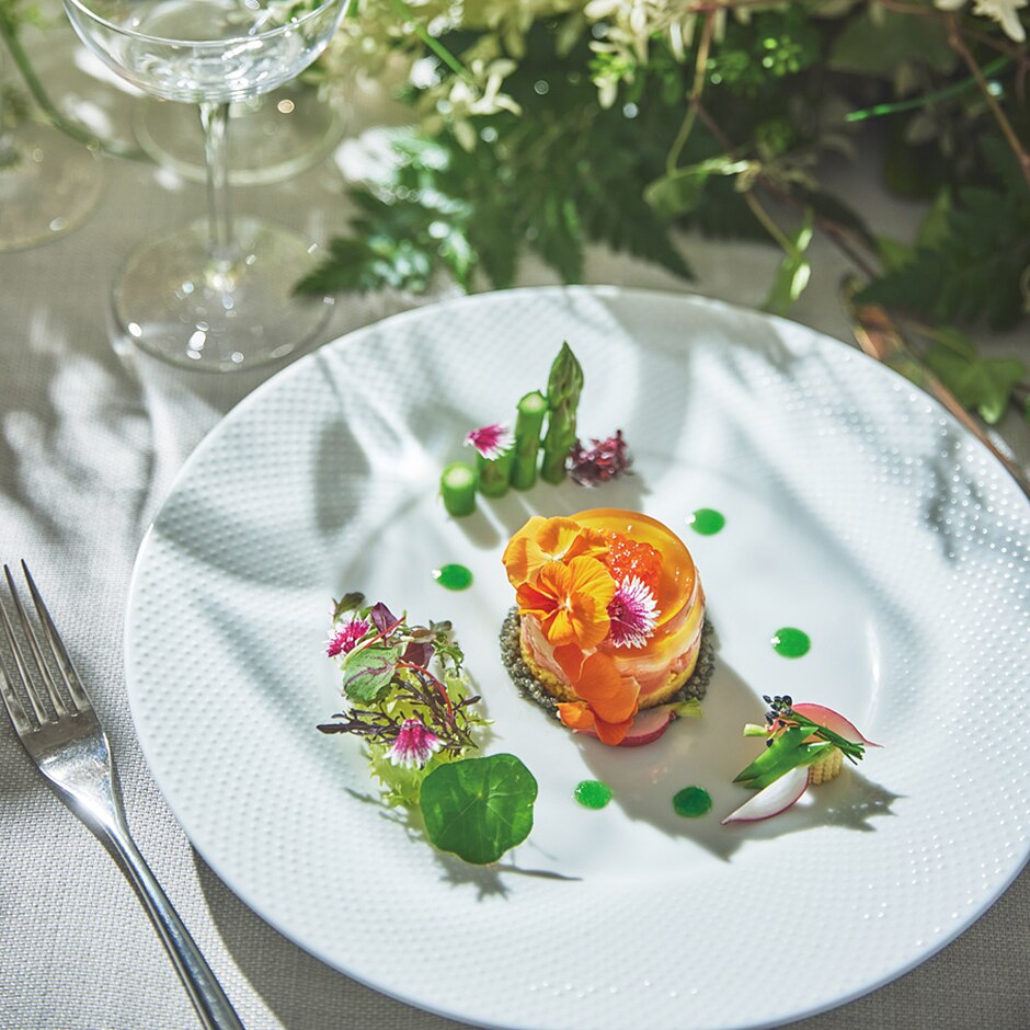 当館の婚礼料理は、<大切な人の“笑顔”が咲く生涯でもっとも贅沢なフルコース>をテーマにひとつひとつの食材選びからこだわっています。また何度ご参列頂いても飽きられないように、毎年料理メニューを一新するなど、工夫を凝らしています。お料理はフェアでご試食頂けますので、お気軽にご予約ください。