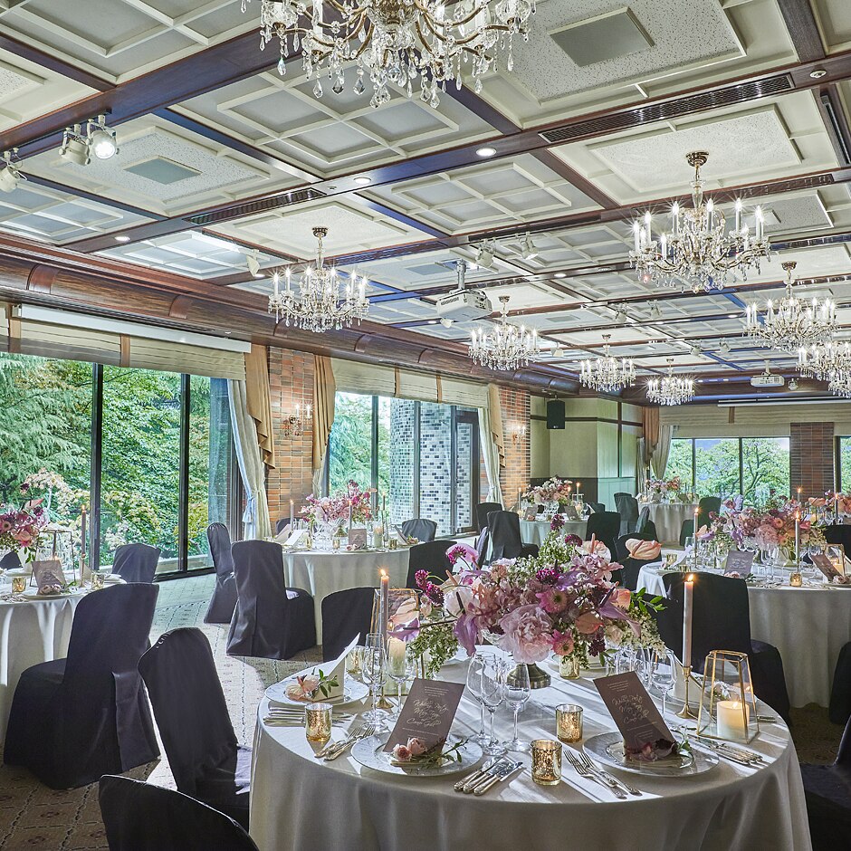 大きな窓の先に広大なガーデンが広がり、たっぷりと射し込む自然光と色鮮やかな緑が、ふたりの特別な一日に彩りを添える。優雅で温かなパーティを叶えて