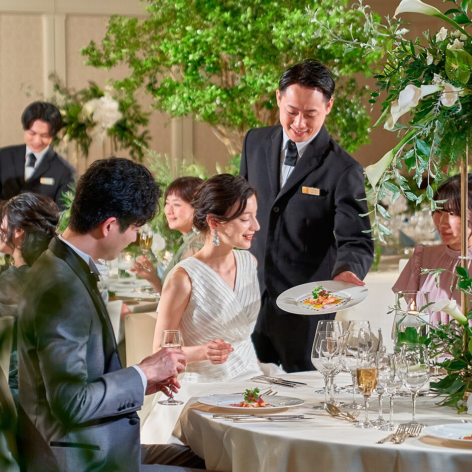 味はもちろん、香り高く見た目もこだわり抜いた料理が大好評。アレルギー対応など徹底された配慮も嬉しい。「おふたりのゲストをおいしい料理でもてなしたい」という総料理長の想いが込められた逸品で感謝を伝えて。