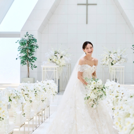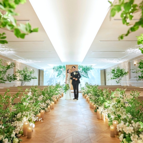 【チャペルへの入場体験】緑あふれるプライベートガーデン付きの独立型チャペル「ホワイトチャペル」と、水と緑がテーマの館内型チャペル「チャペルTENKEI」おふたりの好みに合わせてご案内いたします。