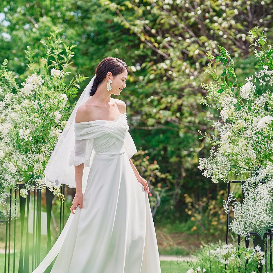ピュアホワイトを基調とした透明感あふれる清楚な空間がドレス姿をより一層際立たせる -