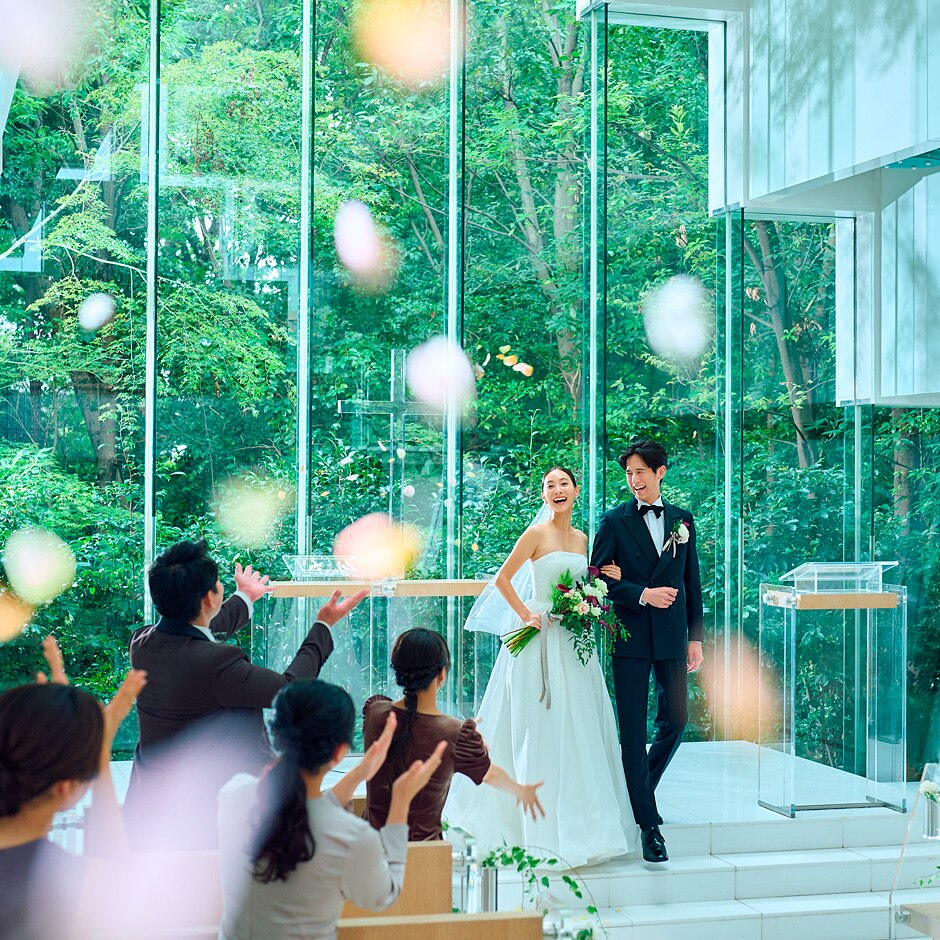 聖壇の先には隣接する芝公園の緑が広がり、都心にいることを忘れてしまいそうな別世界。優しい自然光に包まれながら、生涯忘れることのないウエディングシーンを叶えて。