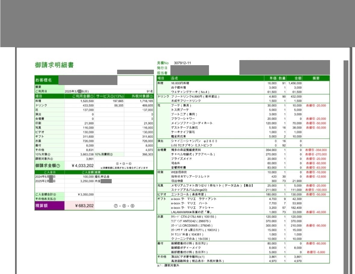 ※投稿された金額情報は、日取り、申込みのタイミングや会場の空き状況等によって異なるため、最終費用明細の項目や金額をもとにした、式場との価格交渉や追加サービス等の要望はご遠慮ください。