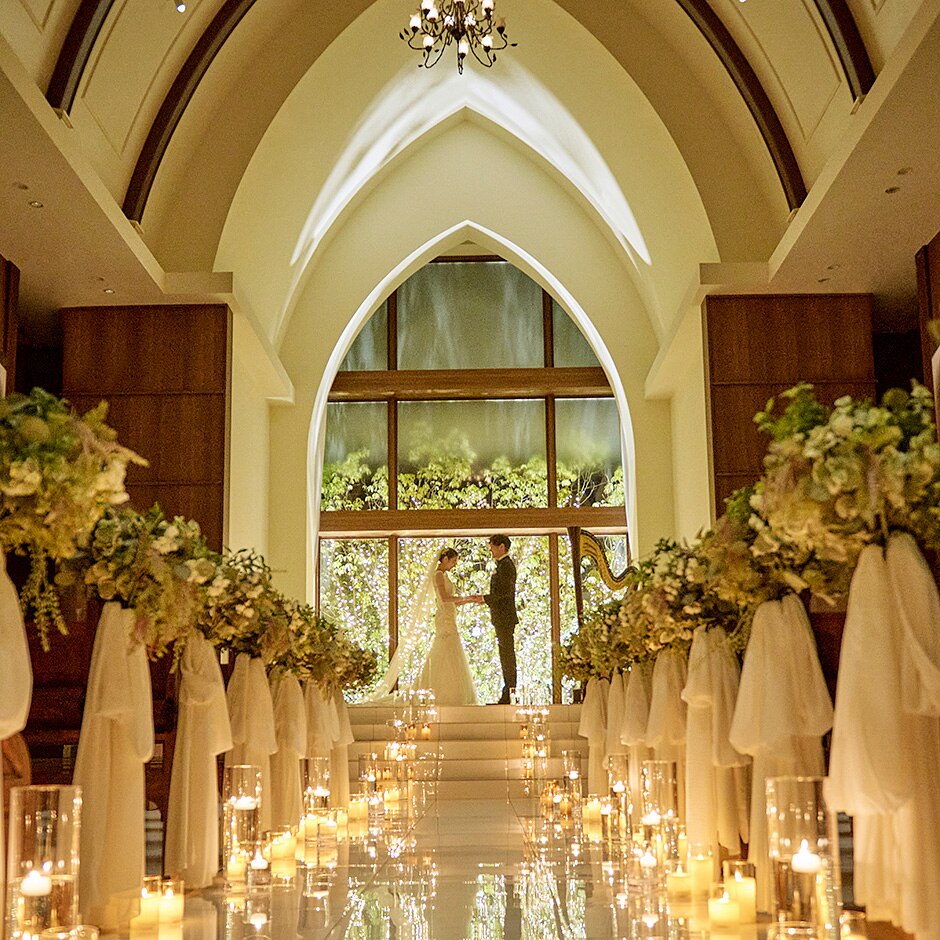 夜のチャペルも素敵な空間に。羽根の演出がより幻想的に。 -