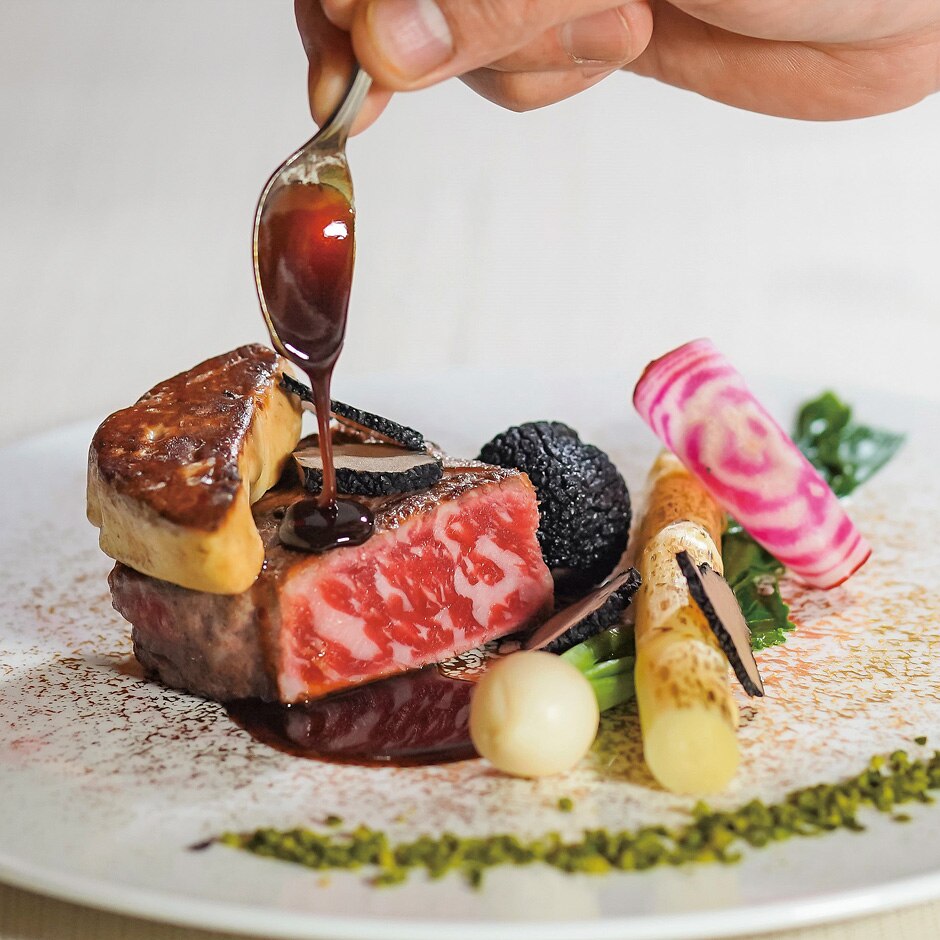 同会場を運営するアイ・ケイ・ケイグループのレストランがミシュランガイドで星を獲得。その確かな味に感謝の想いをこめておもてなし。メニューは年4回フルチェンジし、オリジナルメニューも叶うので気軽に相談を