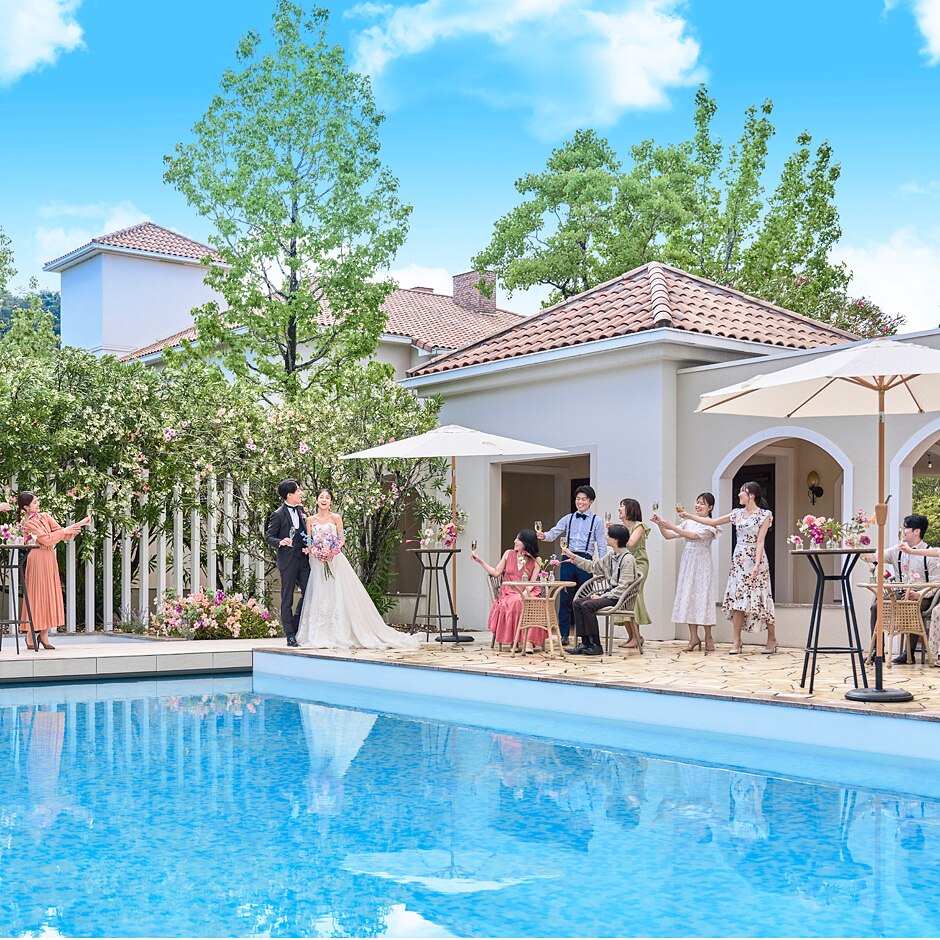 吹き抜けの邸宅には、自然光が差し込む開放的な舞台がスタンバイ。天井まで届く窓の外にはきらめくプールや、緑と花のガーデンが隣接し、ふたりだけですべて貸切!話題のLEDビジョンを使ったサプライズ演出も叶えて