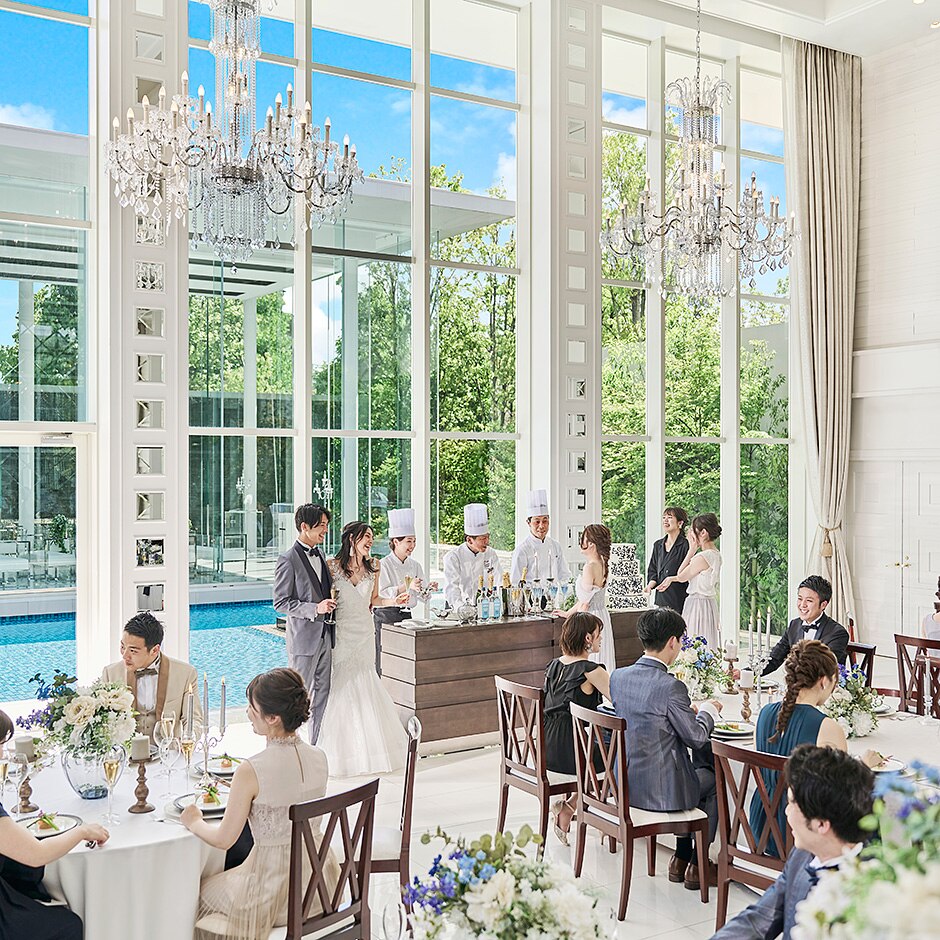 大きな窓の外には緑が広がり、大切な時間を彩ってくれる。開放感あふれる優雅な雰囲気で憧れのウエディングを