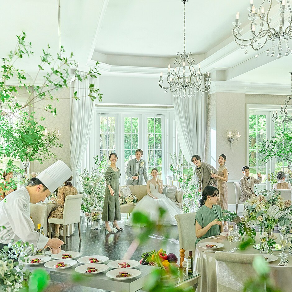白を基調とした空間なので、どんなコーディネートも映える。窓の外には美しいガーデンが広がり、どの席からも緑を感じられ、心地よいひと時を堪能できる。貸切だからこそ叶うこだわりの演出で、記憶に残るパーティを