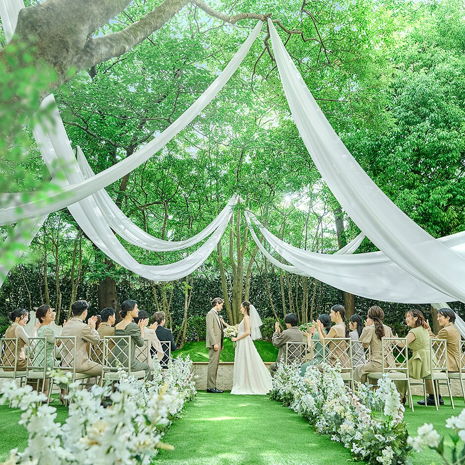 ガーデンには木漏れ日が降り注ぎ、屋内外の移動もスムーズ。赤坂という立地でありながら、周囲は視界が遮られ、プライベート感満載!ふたりもゲストもリラックスして特別な一日をゆったりと過ごすことができる