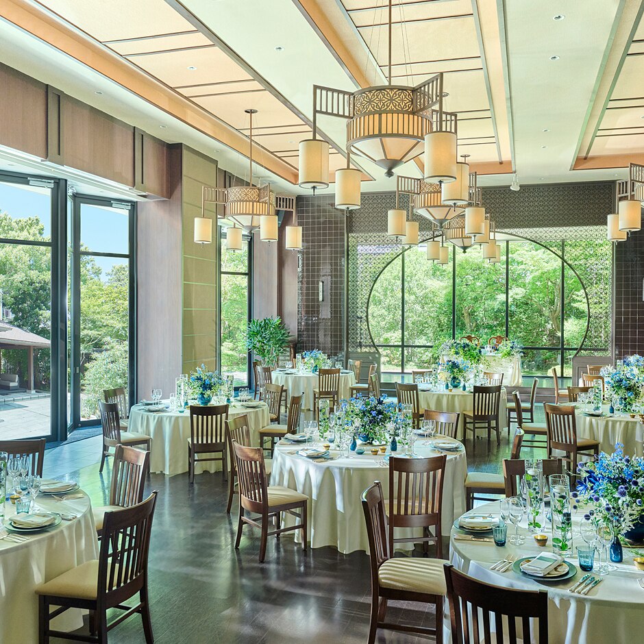 多彩な会場の中でも特に人気の『オリエンタルテラス』邸。透かし彫り細工の窓や森を思わせる木立が背景に広がり、四季を彩る庭園が花嫁姿を美しく魅せてくれる。訪れた人たちが心から寛げる一日を贈ろう。