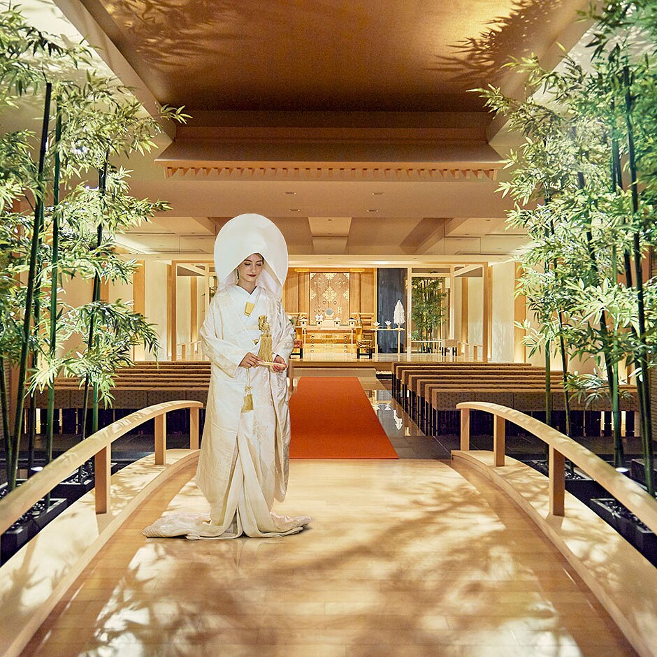 伝統美を感じる水音と木漏れ日に満ちた庭園など、訪れる全ての人々を魅了する上質な空間で結婚式を。チャペルでの花嫁は透明感を纏い美しく輝いて、降り注ぐ陽光もまるでスポットライトのようにふたりを照らす。