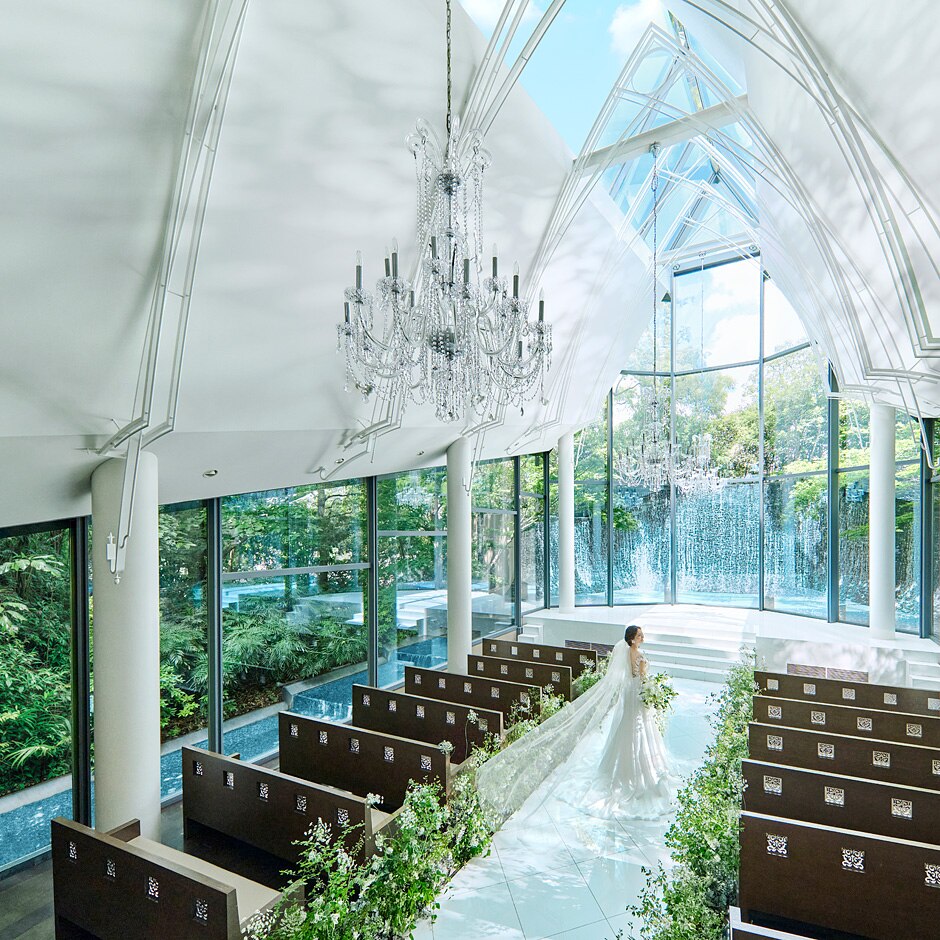 神秘的な滝や水辺に囲まれた唯一無二のチャペル。ゲストも思わず息をのむ瞬間に。