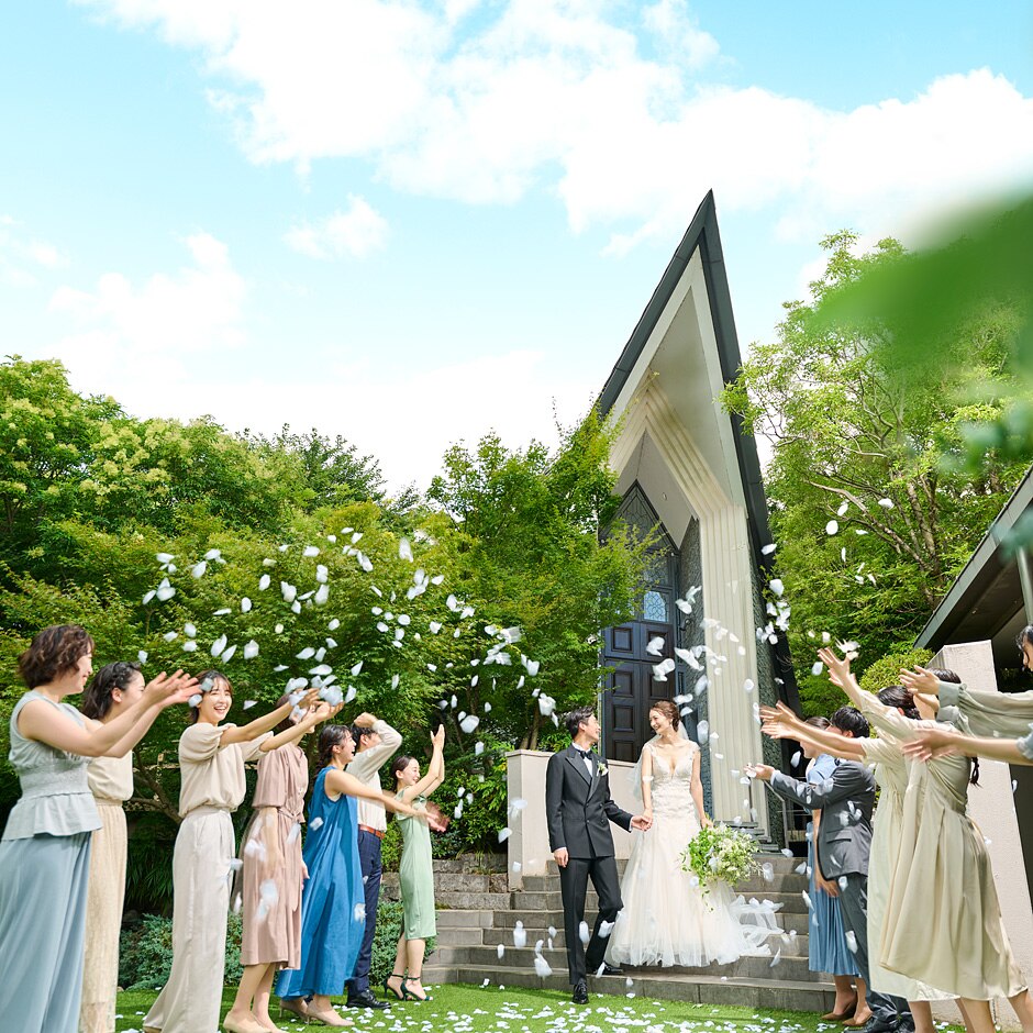 庭園の木々に抱かれるように佇む独立型の「森のチャペル」。式後は空と広大な緑に抱かれた絶景の中、ゲストの祝福に満たされるフラワーシャワーを。プライベート感溢れるガーデンでは人前式もOK!