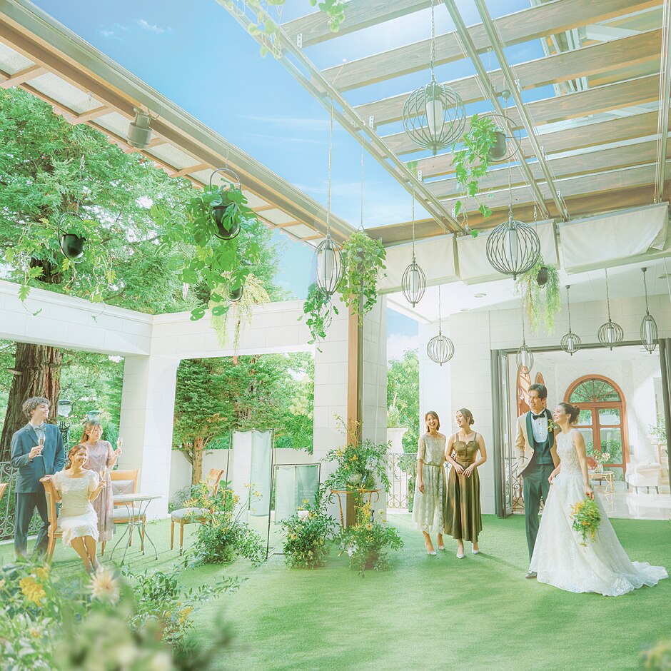 自然光が降り注ぐ「ニューヨーク邸」で迎える特別なひととき。緑豊かなガーデンから入場するふたりを、ゲストみんなの温かな拍手が包み込む。開放的な空間で、大切な人たちとリラックスした時間を過ごして。