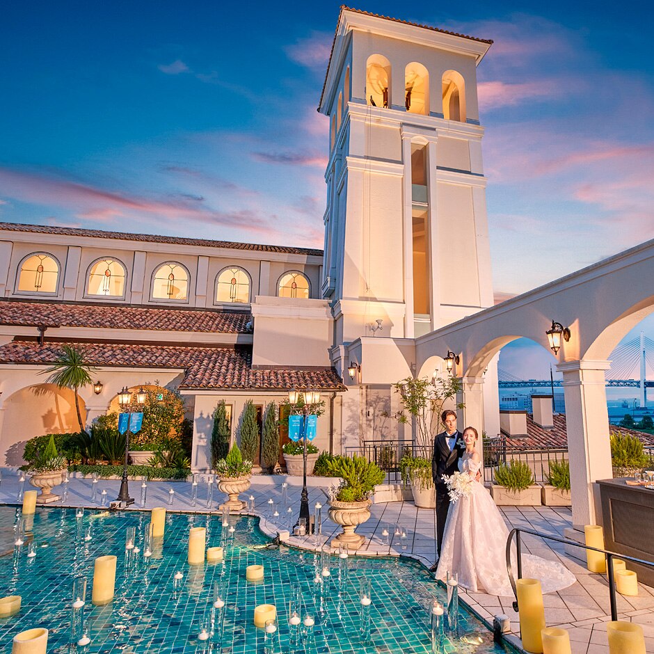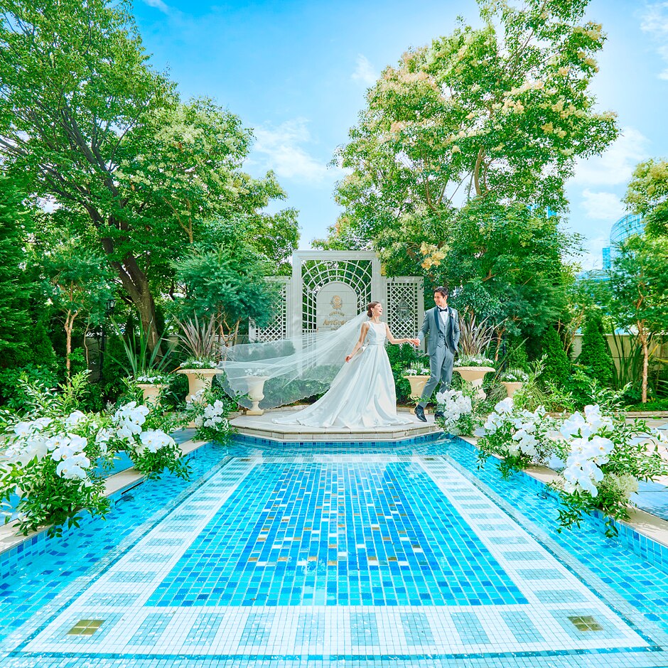 街中の喧騒を忘れさせる景色が広がるプールサイドでは、水面に映る光と街並みのきらめきがふたりを包み込む。華やかでありながらゲストが安心して楽しめる空間設計は、記念の日を過ごす舞台にふさわしい。