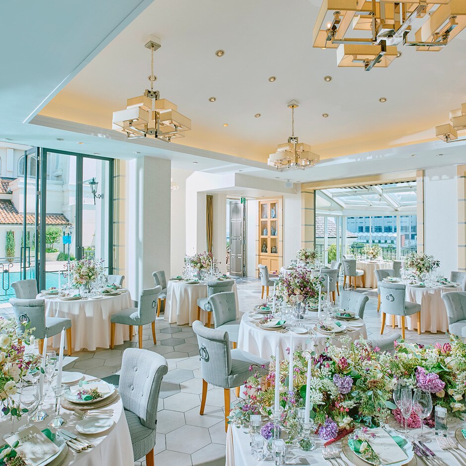 パーティ会場に隣接したプール付きガーデン。誰にとっても心地よく過ごせる、陽光あふれる空間が魅力。