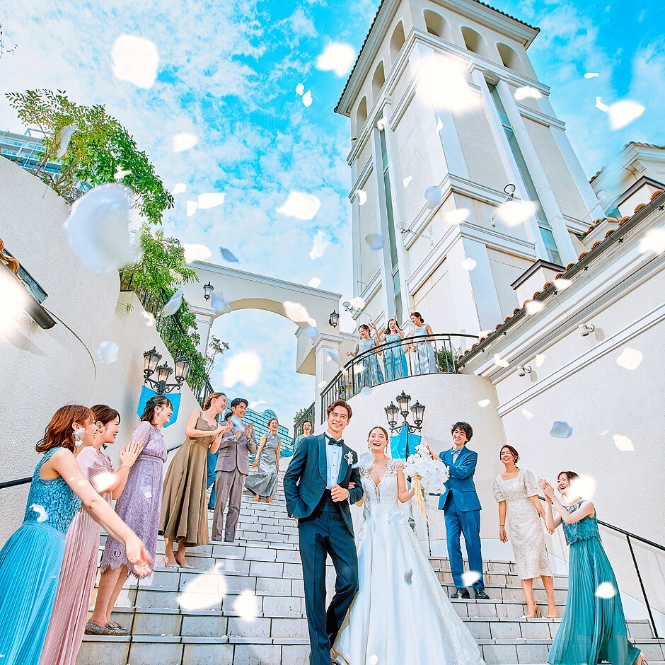 たくさんのゲストから祝福される大階段フラワーシャワーは横浜エリアでも希少。 -