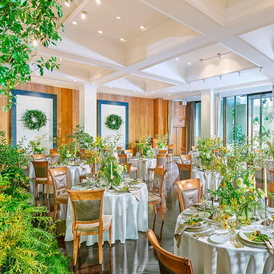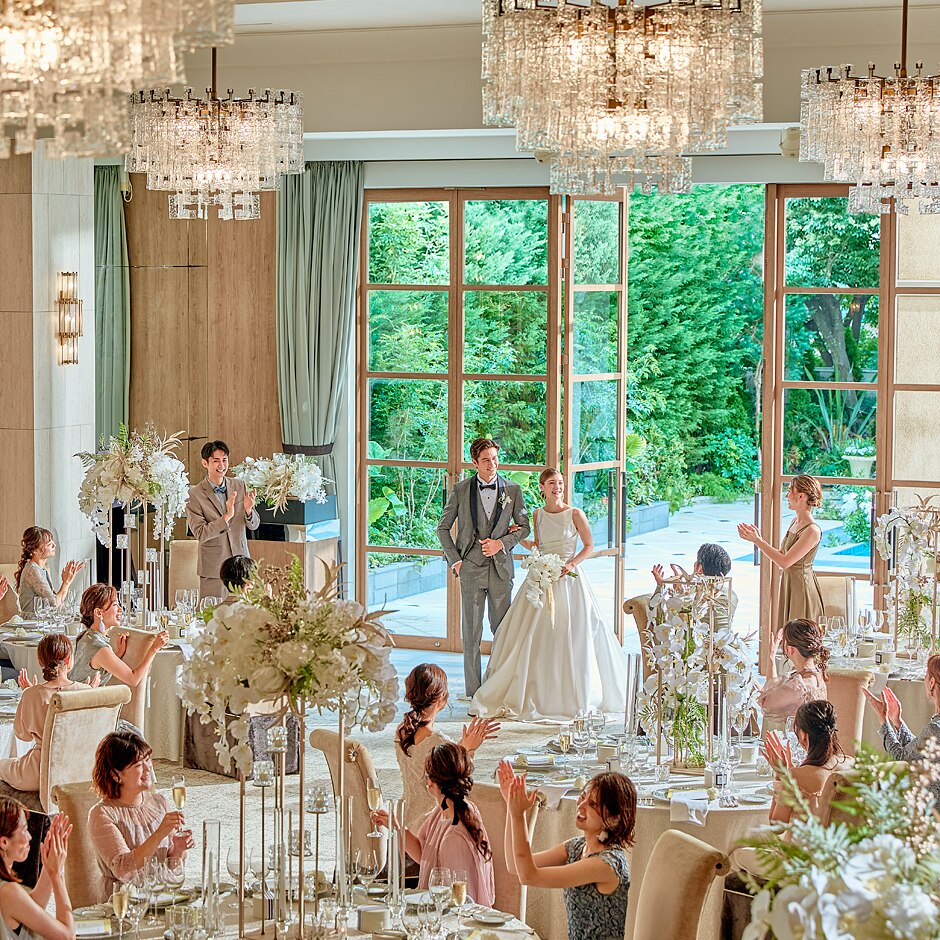 「ニューヨーク邸」のガーデンからふたりが入場すると、ゲストの拍手や歓声が自然と高まり会場中が一気に明るい雰囲気に。屋内と屋外が大きな窓でつながる開放的な導線が、心地よく楽しい時間を作ってくれる。