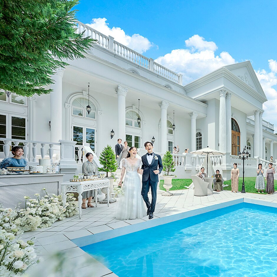迎賓館前のガーデンプールでは海外リゾートのような演出も。プールサイドにウエルカムフードやデザートビュッフェを並べて。全員でバルーンを飛ばしたり、フォトタイムを楽しむなど、アイデアをちりばめた演出を