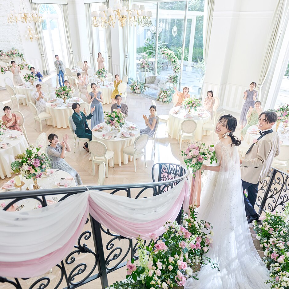 祝福の笑顔に包まれるなか、らせん階段からのサプライズ入場。ふたりらしくヒロイン気分に浸れる演出を