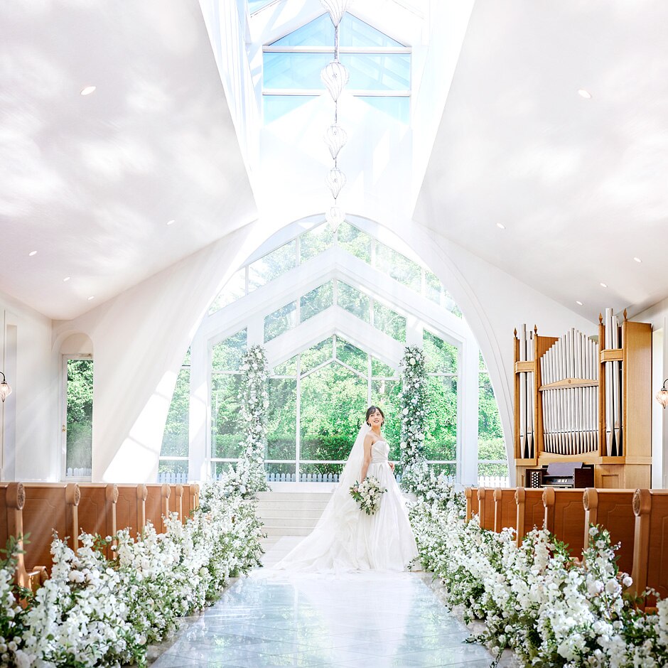 「自分史上いちばんキレイ!」選び抜いた運命のドレスをまとい、光と緑に包まれるチャペルに佇む。天窓から差し込む陽光に照らされた大理石のバージンロードは、希望に満ちた未来へ続くきらめきのカーペットのよう!