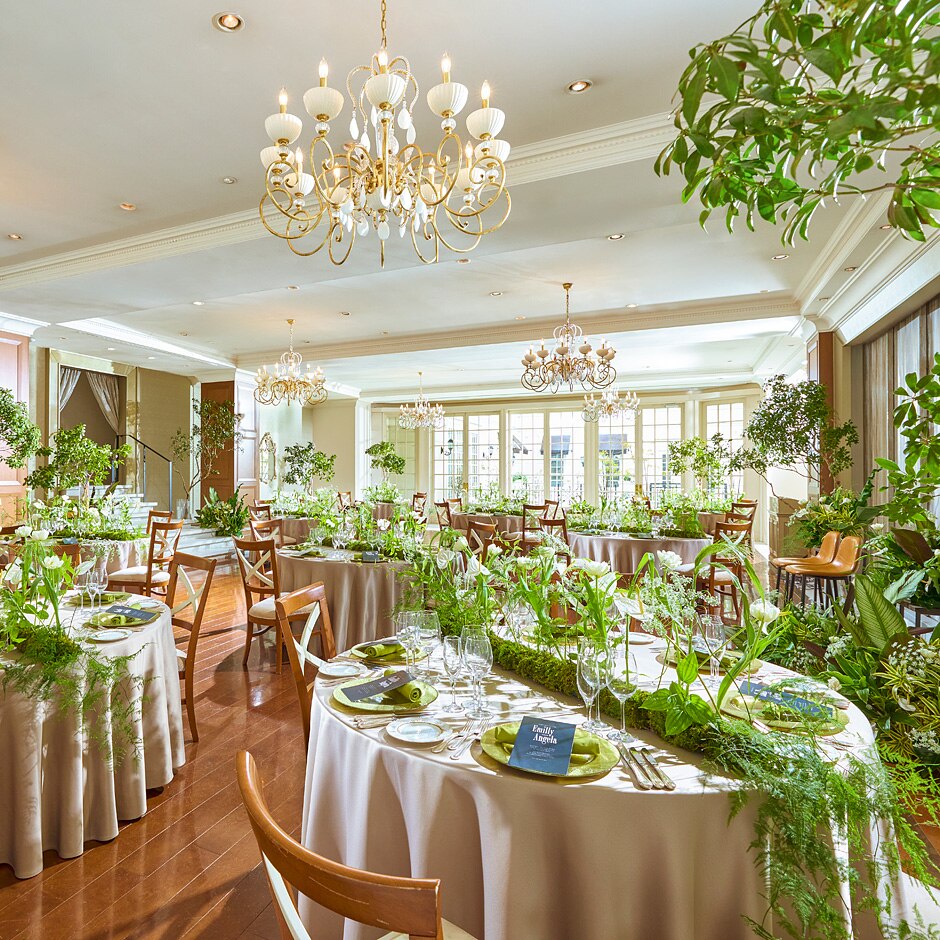 静かな高台に佇むこの迎賓館は、木々の緑と柔らかな光に包まれた心安らぐ場所。都会の喧騒を忘れる、まるで別荘に招かれたようなプライベート感が魅力。1組貸切の自由な空間で、大切な人たちとゆったり過ごす1日を。
