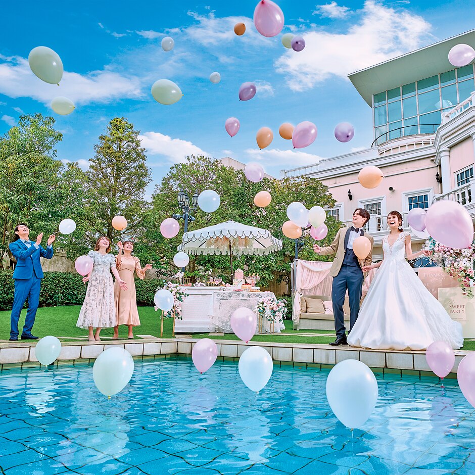 夢に描いたようなパーティが叶う贅沢な邸宅は、すべてふたりの貸切。青空の下、プール付ガーデンでのデザートビュッフェ、ドロップ&フライなど写真映え抜群な演出と、創りこんだふたりの世界観でゲストを驚かせて。