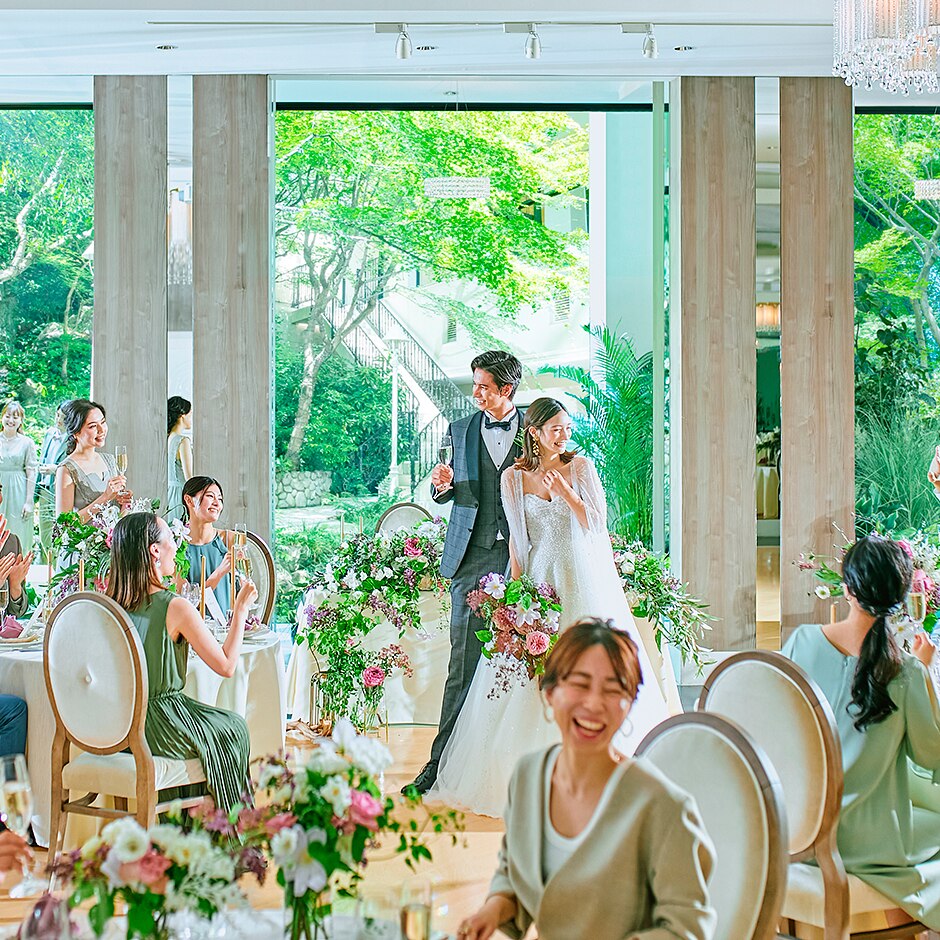 緑が美しい開放感溢れるパーティ会場では、ゲストへの丁寧なおもてなしが叶う。全天候型の広々とした館内では、演出やコーディネートもアレンジ自由。一組貸切で過ごす一日は、忘れられない思い出に。