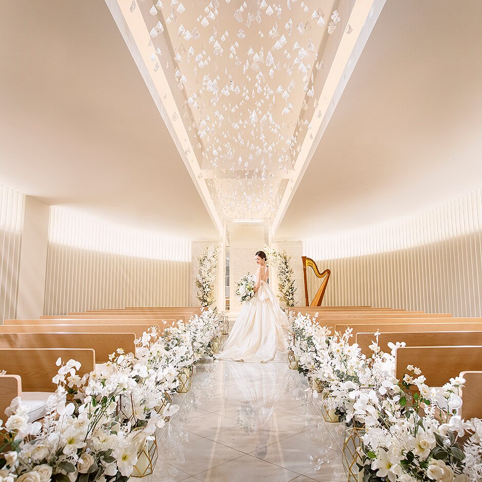 【最大100名】20Mの大理石のバージンロードは圧巻。天井にはスワロフスキークリスタルが燦然と輝く。鏡面仕上げのバージンロードとクリスタルは、ただ佇むだけで花嫁が自然と引き立つような美しい空間を演出。