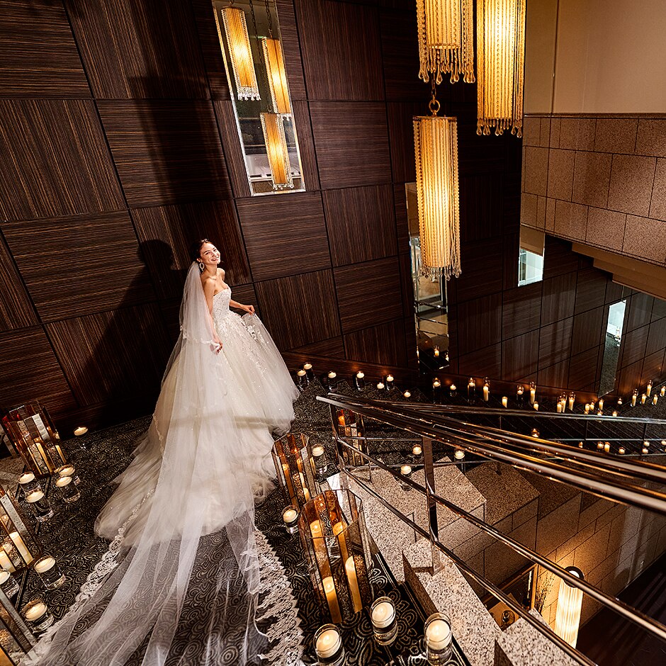 都内では非常に貴重な"大階段"。憧れの階段入場が叶う。結婚式の1日の中で唯一花嫁の足元まで全身が見える階段入場は"ドレスを最も美しく見せる"と言われている