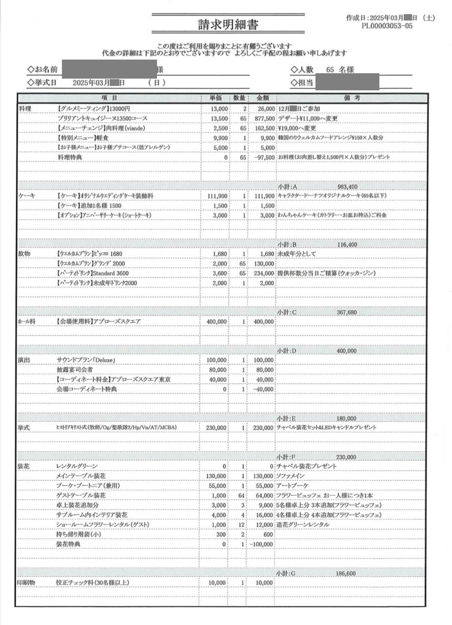※料金実例では申込金などを含む会場に支払った"総額"を表示しています。また、料金明細画像の項目名をもとに独自の基準で分類しています。