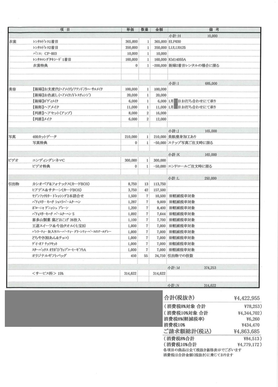 まず初めに、最低限のプランを見せられ、そこから色々特典や、写真、装飾などのオプションがついた見積もりをもらいました。
