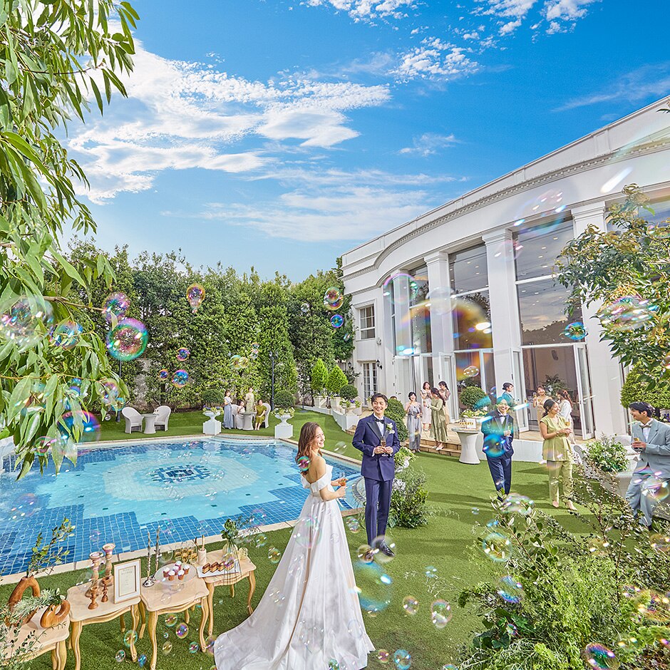独立型大聖堂と選べるガーデン付き貸切邸宅は、緑溢れるナチュラルな会場や演出自由なプール付き会場など多彩。ウエルカムパーティやフォトジェニックなスポットなどゲストと楽しめる。非日常の世界が広がる中で、笑顔と幸せに満ちた1日を過ごそう。