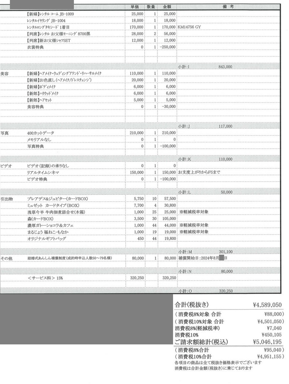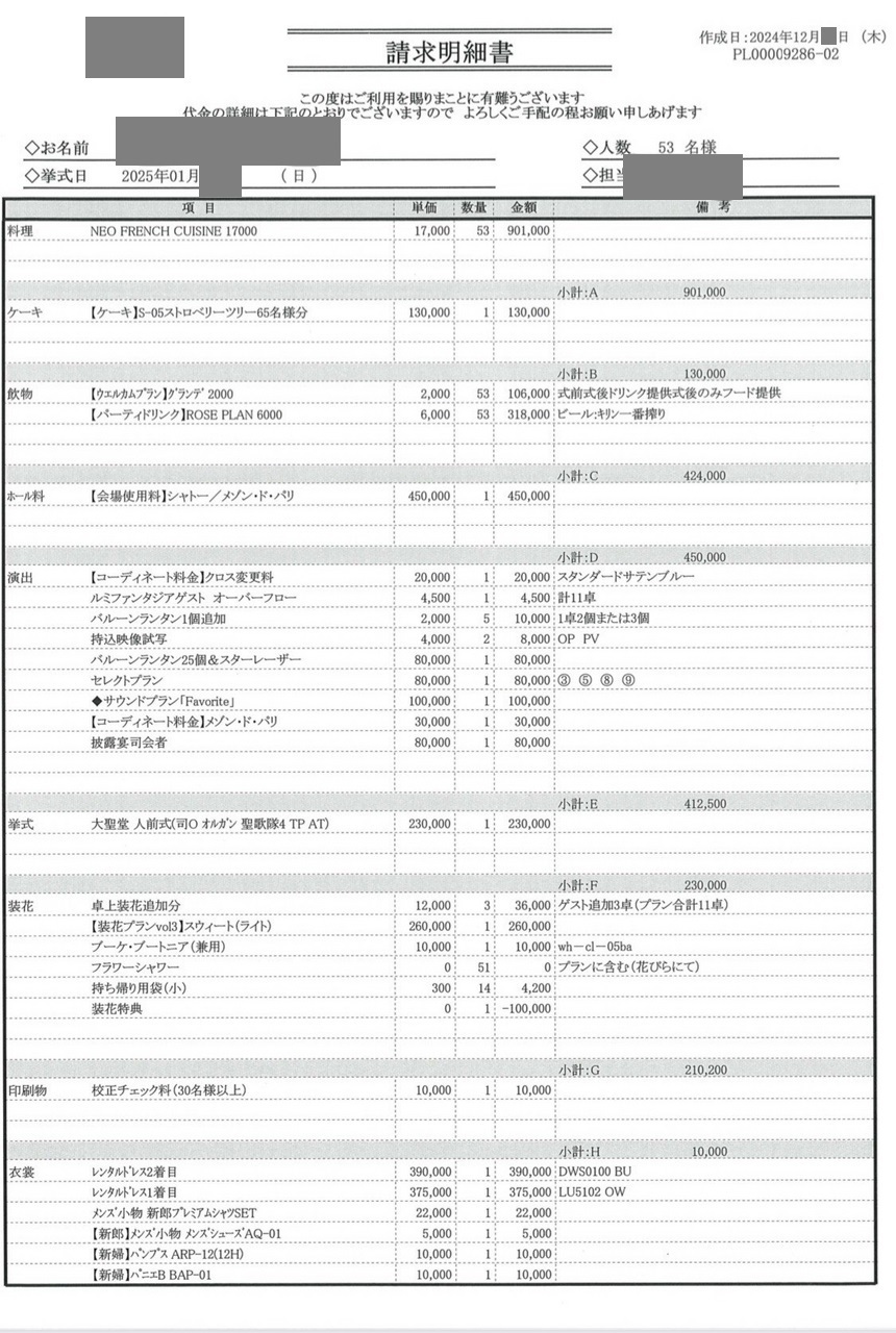 ※料金実例では申込金などを含む会場に支払った"総額"を表示しています。また、料金明細画像の項目名をもとに独自の基準で分類しています。