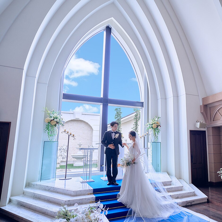 スペインのアンダルシアに実在する教会をモチーフにした本格大聖堂は大きなガラス窓から緑・光・空があふれる温かい雰囲気。ふたりの表情も、ゲスト一人ひとりの表情もしっかりと見え、感動的な挙式に