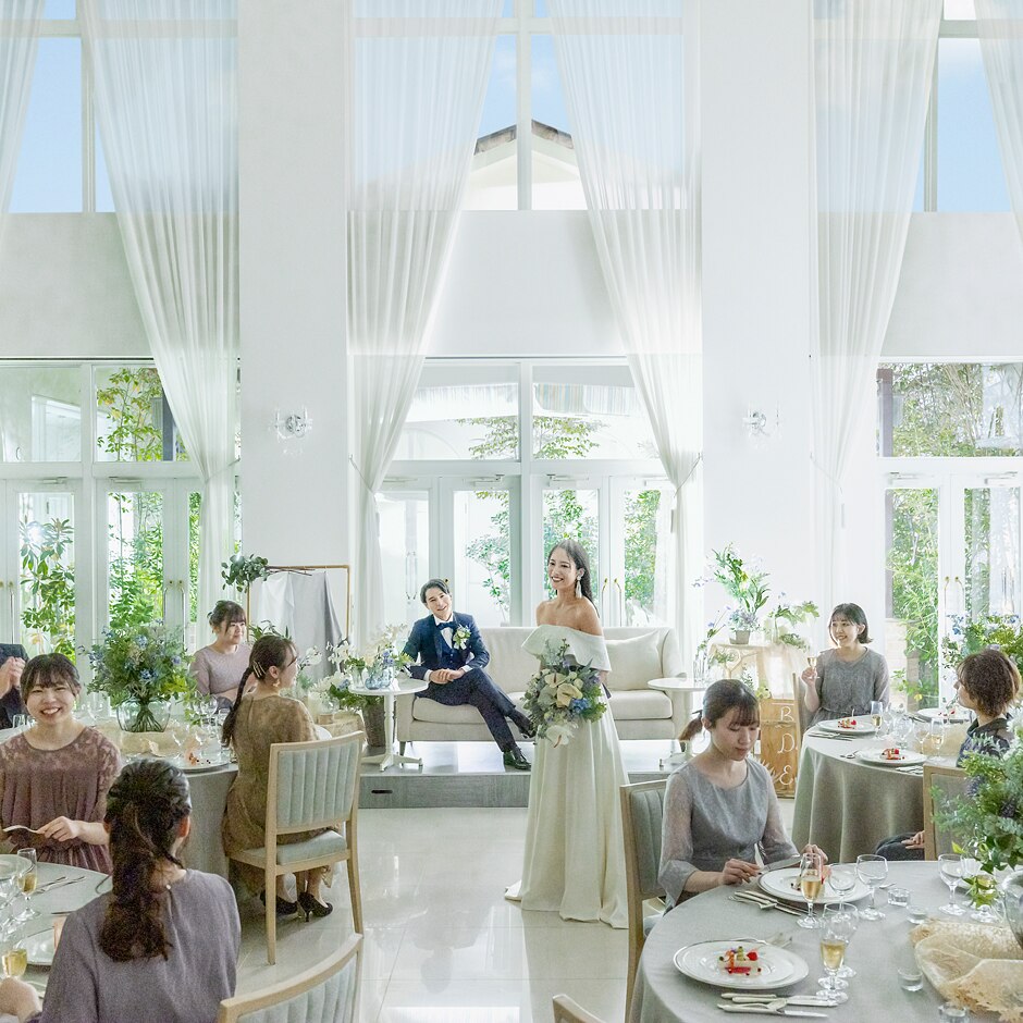 光と緑に囲まれたプライベート空間で自由なウエディングが叶う会場。披露宴会場には木漏れ日が差し込み明るくゲストも自然とリラックスするような空間。ナチュラルな雰囲気でゲストをあたたかい時間を過ごして!