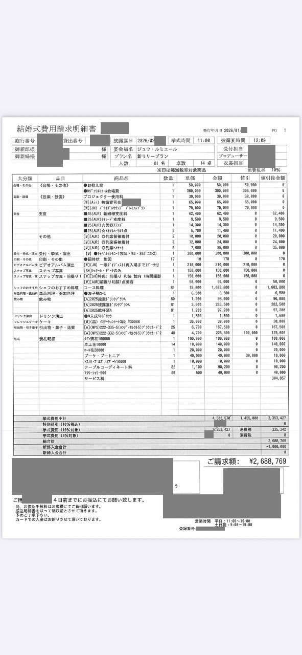 ※投稿された金額情報は、日取り、申込みのタイミングや会場の空き状況等によって異なるため、最終費用明細の項目や金額をもとにした、式場との価格交渉や追加サービス等の要望はご遠慮ください。